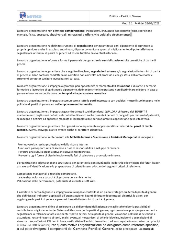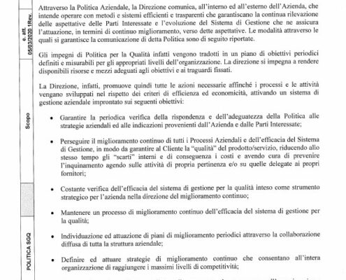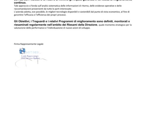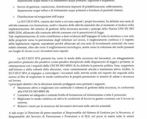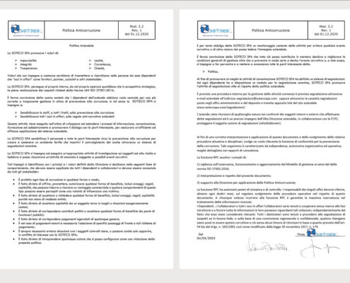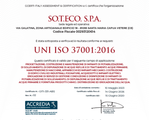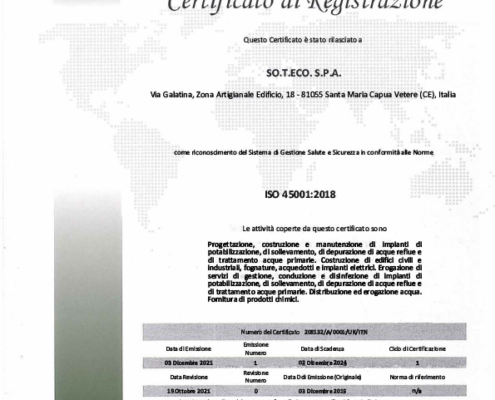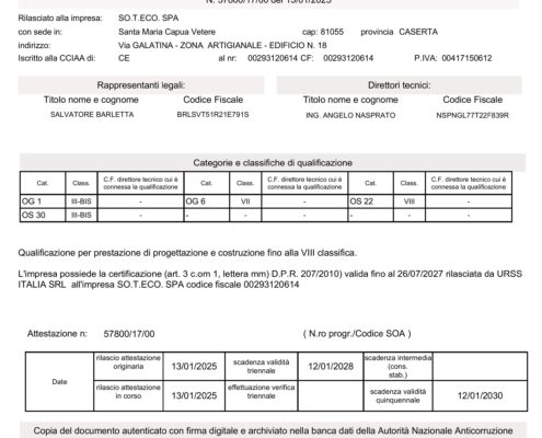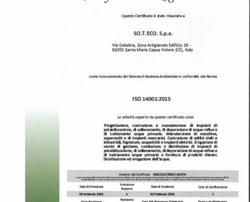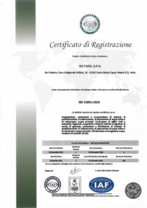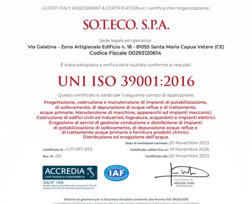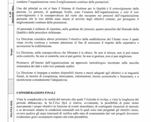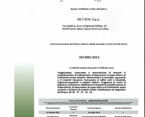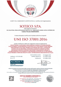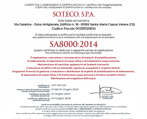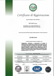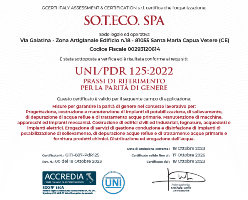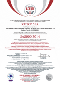 La SO.T.ECO. S.p.A. opera con il proprio Sistema Qualità certificato secondo le UNI EN ISO 9001-2015, ISO 14001:2015, ISO 45001:2018, SA8000:2014, ISO 37001:2016, UNI/PDR 125:2022, ISO 39001:2016 monitorandone l’attualità e la coerenza con gli obiettivi prefissati. Inoltre la SO.T.ECO. S.p.A. ha ottenuto Medaglia di bronzo Ecovadis con un punteggio di 65/100