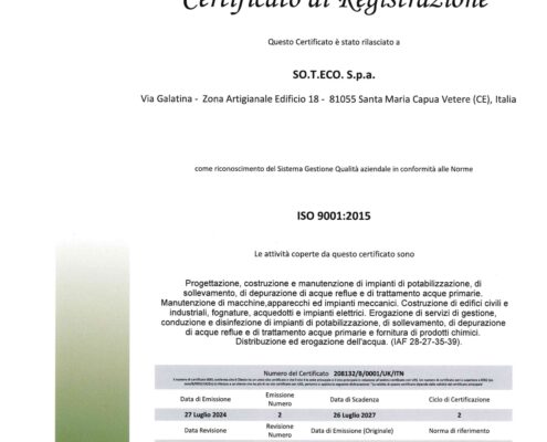 La SO.T.ECO. S.p.A. opera con il proprio Sistema Qualità certificato secondo le UNI EN ISO 9001-2015, ISO 14001:2015, ISO 45001:2018, SA8000:2014, ISO 37001:2016, UNI/PDR 125:2022, ISO 39001:2016 monitorandone l’attualità e la coerenza con gli obiettivi prefissati. Inoltre la SO.T.ECO. S.p.A. ha ottenuto Medaglia d’argento Ecovadis con un punteggio di 78/100